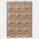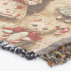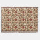 Um cobertor muito bonito com bonecas, gatinhos, fitas vermelhas, canetas doces, pacotes de natal, ramificações de pínus e pinecones.