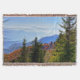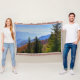 Uma paisagem serena de montanha apresenta colinas enroladas adornadas com uma vibrante folhagem de queda, criando uma tapeçaria colorida contra os picos distantes e cobertos por neblina. Árvores altas e verdes enquadram o primeiro plano, adicionando profundidade à vista de tirar o fôlego.