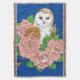 Uma coruja de celeiro com lua crescente em sua testa está sentada entre flores rosa em um pano de fundo de azul escuro.