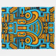 Um design de arte geométrica arrojada e vibrante inspirada por motivos tribais e abstrato. A trabalho de arte apresenta tons impressionantes de azul-turquesa, amarelo-ouro e preto-profundo, dispostos em um padrão simétrico que sinta moderno e eterno.