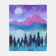 Uma paisagem de abstrato com cores e texturas únicas mostrando uma cena de montanha com árvores e neblina névoa em tons de roxo, azul, lacre e ciano.