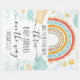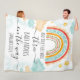 "E então havia três, bebê a caminho", cobertor de anúncio de gravidez com um belo arco-íris e nuvens embebidas com nome de bebê e data de vencimento.