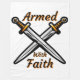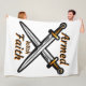 Este cobertor de velo exibe as palavras "Armado com Fé" em uma frente única de impressão com letras negras com contorno laranja que apresenta um conjunto de espadas cruzadas entre si no centro com esse tema de citação baseado na fé. Este cobertor é feito de um veleiro de 100% de tecido mole e confortável veloz velo de poliéster com impressão de cor de cheio vibrante borda a borda e colagem de borda dupla com uma máquina de trás colorido esbranquiçada lavável.
