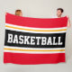 Este design desportivo apresenta texto BASKETBALL em negrito dentro de de uma faixa de corridas horizontal em preto, realçada com pinças brancas duplas flutuantes contra faixas externas brilhantes e vermelhas. O texto pode ser personalizado.