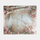 Bela pintura em aquarela de árvores de bétula branca ao longo de um rio rural. Rosas cor-de-rosa elegantes decoram a borda deste cobertor de flanela nesta cena tranquila da floresta.