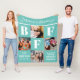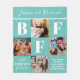 Modern friendship blanket featuring 4 photos of you and your bestie, a teal background that can be changed to any color, the letters "BFF", the words "best friends forever", a true friends quote, and your names.
