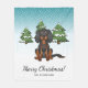 A ilustração original de desenho animado de Destei de um cão da raça Cavalier, preto e de cor bronca. O cachorro é colocado numa cena de inverno. No local, está nevando ao fundo e há três pés verdes atrás do cão. As árvores têm neve neles. O fundo é um gradiente azul-claro a branco que dá a esta design aquele congelando do dia frio de inverno. Há também uma área de texto personalizável que agora lê "Feliz Natal!" em uma bela fonte de script. Sob ela, há outra área de texto personalizável para um nome de família ou outro texto personalizado.