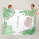 Este cobertor bonito de velo é decorado com uma aquarela original de uma preguiça bebê sorridente pendurada num galho cercado por folhas da selva.