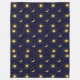 Front view: Blanket with deep blue background featuring a repeating pattern of yellow suns and crescent moons. Back view: Plain white fabric.