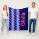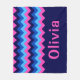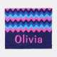 A medium sized, monogrammed fleece blanket featuring a bright, colorful pattern design of blue and pink chevrons.