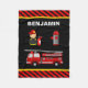 Um cobertor do tema do motor de incêndio bonito, com um belo caminhão de incêndio e elementos fofos de extinção de incêndios. Personalize-o com o nome do seu filho.