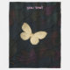 A imagem mostra um cobertor tecido com uma borboleta grande de ouro no seu centro sobre um fundo texturizado escuro com tons sutis de roxo e azul. O cobertor tem bordas franjas e inclui o texto personalizável de marcador de posição "texto" rosa ao longo do lado.
