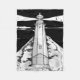 Uma ilustração a preto e branco do farol no final do banco de pedras em Nelson, Nova Zelândia. Este farol está no corte perto e tem a ilha de costa ao fundo.