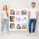 Um presente para o aniversário de 16 anos de uma garota, celebrando sua vida com uma colagem de 8 fotos suas. Modelos para um nome, 16 anos e uma data. Data de nascimento ou data do aniversário. Letras cor-de-rosa e púrpura. Fundo branco colorido.