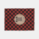 Um cobertor de velo com ilustração de um urso. O fundo é xadrez de búfalos preto e vermelho. Personalize o nome.
