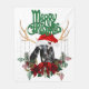Cabra Núbia bonita com seu chapéu de Papai Noel e galhadas adornada com Enfeites de natal listrados, cercada por uma coroa de natal de poinsetos vermelhos, cones de pínus, verde e um grande arco vermelho. Caligrafia Texto na frente diz Feliz Natal, A © gata GetYerGoat™ original Este lindo bode bebê é uma pintura de Chuck - minha amiga Sue Weaver - ele é lindo