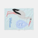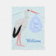 Este maravilhoso cobertor de velo apresenta uma imagem gráfica de uma bela Stork branca com penas pretas de cauda segurando-se num pacote azul pálido de cobertores. Há um texto azul no pacote que diz "Menino". Esta design é perfeita para celebrar um menino.