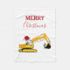 Uma bela ilustração de uma escavadora de brinquedo amarelo vestindo um chapéu de Papai Noel e decorado em luzes de Natal cavando alguns presentes de Natal com palavras "Feliz Natal". Perfeito para amantes de caminhões de construção de todas as idades. Um cobertor de Natal ideal para entusiastas de caminhões escavadores grandes ou pequenos, meninas ou meninos.