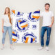 Este cobertor de velo de galeota divertida apresenta cinco volicbolas azuis, laranja e brancas, organizadas aleatoriamente com o texto, "A quadra de vôlei é meu lugar feliz" em laranja cercando cada vôlei em uma fonte tipográfica legal, tudo em um fundo branco - seu nome e número de camisola são personalizáveis - por katz_d_zynes