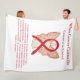A arte apresenta o "Anjo de Fita Vermelha" para apoiar a conscientização sobre o cancer sanguíneo. A arte mostra um anjo da guarda segurando uma fita vermelha de conscientização e o poema do "O que o Cancer não pode fazer" gira ao redor dela. As palavras do poema dizem "O que o Cancer não pode fazer, o Cancer é tão limitado... Não pode aleijar o amor. Não pode destruir a esperança. Não pode corroer a fé. Não pode destruir a paz. Não pode matar amizade. Não pode suprimir memórias. Não pode silenciar a coragem. Não pode invadir a alma. Não pode roubar a vida eterna. Não pode conquistar o espírito. -Autor Desconhecido" Faça com que a equipe de conscientização do cancer personalizada fique em branco para você ou como presente para um ente querido. Adicione suas próprias palavras ou imagens a este cobertor de quimio flexível para obter presentes especiais de cancer de fita de reconhecimento.