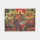 pintura colorida nos vermelhos e nos ouro "da última ceia" pelo ushakov de simon. jesus está em uma mesa retangular longa com os doze apóstolos com halos dourados. o cálice do vinho e a bandeja do ouro com pão na mesa em um interior decorado com um vermelho bonito drapejam. cores corajosas brilhantes e pintura belamente equilibrada com um fluxo bonito dos halos dourados que criam um teste padrão brincalhão. estilo decorativo, do ícone, e pintado o século XVII em uma pintura iconográfica brilhante e corajosamente colorida do estilo da história do novo testamento da última ceia.