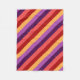 Um cobertor de velinha de pequeno porte que apresenta um padrão colorido de faixas diagonais em vermelho cereja, rosa melão, violeta, roxo de ameixa e amarelo de banana.