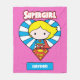 Veja a Supergirl Chibi parada em frente a um coração azul e branco de explosão de estrelas, no topo do seu S-Shield com sobra de nome.