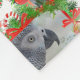 Um papagaio festivo da Cinza africana do Congo adornado com ramos de árvores de Natal e ornamentos pendurados com fitas vermelhas e canetas doces.