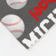 Um cobertor de nomes personalizado de beisebol desportivo. Este cobertor típico com formato de esporte tem bolas de baseball e pequenas cinzas, vermelho, cinzas de médio e texto branco sobre o fundo da cinza de carvão negro. Personalize com seu próprio nome, lê Michael. Outras bolas de esporte neste design estão disponíveis. Projetado por www.mylittleeden.com