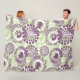 Esse cobertor de velo grande tem um design geométrico de círculos decorados com linhas e círculos feitos de pontos repetidos em beringela e verde.