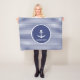 Esta cobertura azul e branca tem listras horizontais. No centro, há uma âncora branca do barco e um lugar para dar entrada com o nome do receptor. Esta cobertura personalizada é uma adição agradável à sala de um miúdo.