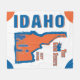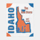 As características de design de Idaho uma ilustração de um personagem de desenho animado do saco da batata que pendura para fora na tipografia que lê o apelido de Idaho, "o estado da gema", uma silhueta da skyline ano do statehood de Boise, e de Idaho.