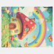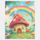 Cogumelos bonitos com chapéus vermelhos, castanhos e azuis com manchas brancas. Um céu azul com arco-íris. Belo toque na parede de um quarto infantil.