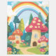 Cogumelos bonitos com chapéus vermelhos, castanhos e azuis com manchas brancas. Um céu azul com arco-íris. Belo toque na parede de um quarto infantil.