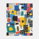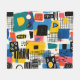Este trabalho de arte apresenta uma composição dinâmica e eclética de formas de abstrato, padrões e texturas, agrupadas em um arranjo semelhante a colagem. O design incorpora cores em negrito, como azul, amarelo, vermelho e preto, com cada elemento variando em tamanho e forma. Linhas desenhadas à mão, grades e pinceladas acrescentam uma sensação lúdica e espontânea à peça, enquanto a disposição irregular das formas cria um senso de movimento e energia. A combinação de formas geométricas e marcas à mão livre dá à trabalho de arte uma visão moderna e artística.