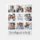 Este cobertor de família simples e na moda apresenta seu nome de família em um roteiro preto manuscrito em uma cinza quadrada no centro, e as palavras "amor, felicidade, família" separadas por corações rabiscados. A grade de colagem de fotos tem espaço para mostrar oito de suas fotos pessoais favoritas para um presente único que sua família amará.
