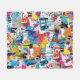 Colorful urban graffiti patchwork pattern blanket featuring bold abstract blocks, expressive brush strokes, scribbles, stars, and mixed-media textures in bright blue, yellow, pink, orange, and black. Energetic and edgy with a modern street art aesthetic, this seamless design is ideal for graffiti art lovers, maximalist style fans, creative teens, and contemporary art enthusiasts.