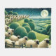 A flock of sheep roams across rolling hills under a starry night sky, with a bright full moon illuminating the landscape. The scene captures the tranquility of the countryside, with lush, green fields and neatly arranged trees.