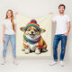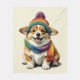 Um cobertor macio e aconchegante com um adorável cachorrinho de corgi com uma expressão feliz, vestindo um chapéu vibrante e colorido e um cachecol correspondente. Perfeito por adicionar calor e beleza a qualquer espaço!