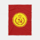 Design comunista do crachá com o martelo e a foice, uma grinalda do louro e uma estrela cercadas por um círculo amarelo.