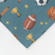 Este cobertor azul giro para crianças apresenta um padrão esportivo, com futebol, bola de futebol, raquete e bola de tênis, troféu, basquete e estrelas. O cobertor pode ser personalizado com seu nome e monograma. O presente perfeito para qualquer amante desportivo!