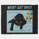 Um gato preto giro deitado preguiçosamente em um sofá azul pensando sobre como eles tinham sorte de serem adotados pelo seu Pai.