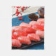 This luxurious fleece blanket showcases a stunning lineup of glistening tuna nigiri on a traditional ceramic plate, accompanied by soy sauce, ginger, and decorative red berries. The serene blue fabric background adds a refined touch that blends beautifully with the vivid reds and soft pastels of the sushi.