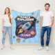 Este cobertor de fleece personalizado apresenta um emblema ousado de explorador espacial. No centro do emblema está um foguete de desenho animado divertido voando pelo espaço com planetas orbitando ao seu redor.