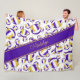 Esta legal equipe de vôlei colore o cobertor de velhas para meninas apresenta um padrão variado de púrpura estilizada, ouro e volichões brancos virados de qualquer forma sobre um gráfico detalhado da rede de vôlei - os painéis roxo e ouro das bolas de volleyball são misturados com uma arte, padrão floral feminino - personalizam seu nome em uma sofisticada fonte escrita à mão sobre uma faixa de cor arrojada, angular, largura do cheio roxa e roxa - fundo e nome as cores de strip são personalizáveis - por katz_d_zynes