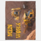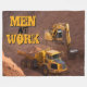 Esta cobertura legal do velo caracteriza uma foto impressionante de um trator amarelo do escavador e de um camião basculante em um canteiro de obras com o texto customizável, "homens no trabalho."