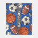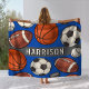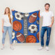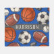 Perfeito para atletas de todas as idades e famílias para eventos desportivos. Fique aquecido nos jogos infantis de futebol, hóquei e basquete e se abrace no sofá com este monograma personalizado de cobertor de velo com vários esportes. Inclui um padrão legal e único de fronteiras ilustrado de bolas de esporte e patas de hóquei junto com o costume moderno, todos os bonés esboçados que podem ser personalizados com o primeiro ou o sobrenome. Inclui uma cor azul real de fundo.