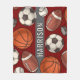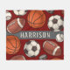 Perfeito para atletas de todas as idades e famílias para eventos desportivos. Fique aquecido nos jogos infantis de futebol, hóquei e basquete e se abrace no sofá com este monograma personalizado de cobertor de velo com vários esportes. Inclui um padrão legal e único de fronteiras ilustrado de bolas de esporte e patas de hóquei junto com o costume moderno, todos os bonés esboçados que podem ser personalizados com o primeiro ou o sobrenome. Inclui uma cor vermelha de fundo profunda.