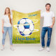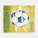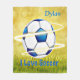 O bohek amarelo ilumina-se com grama verde e uma bola de futebol azul e branca.