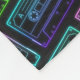 Um cobertor colorido de velo com padrão de cassete multicolorido neon. Inclui cassetes de áudio com cores rosa, azul, roxo e verde no fundo preto